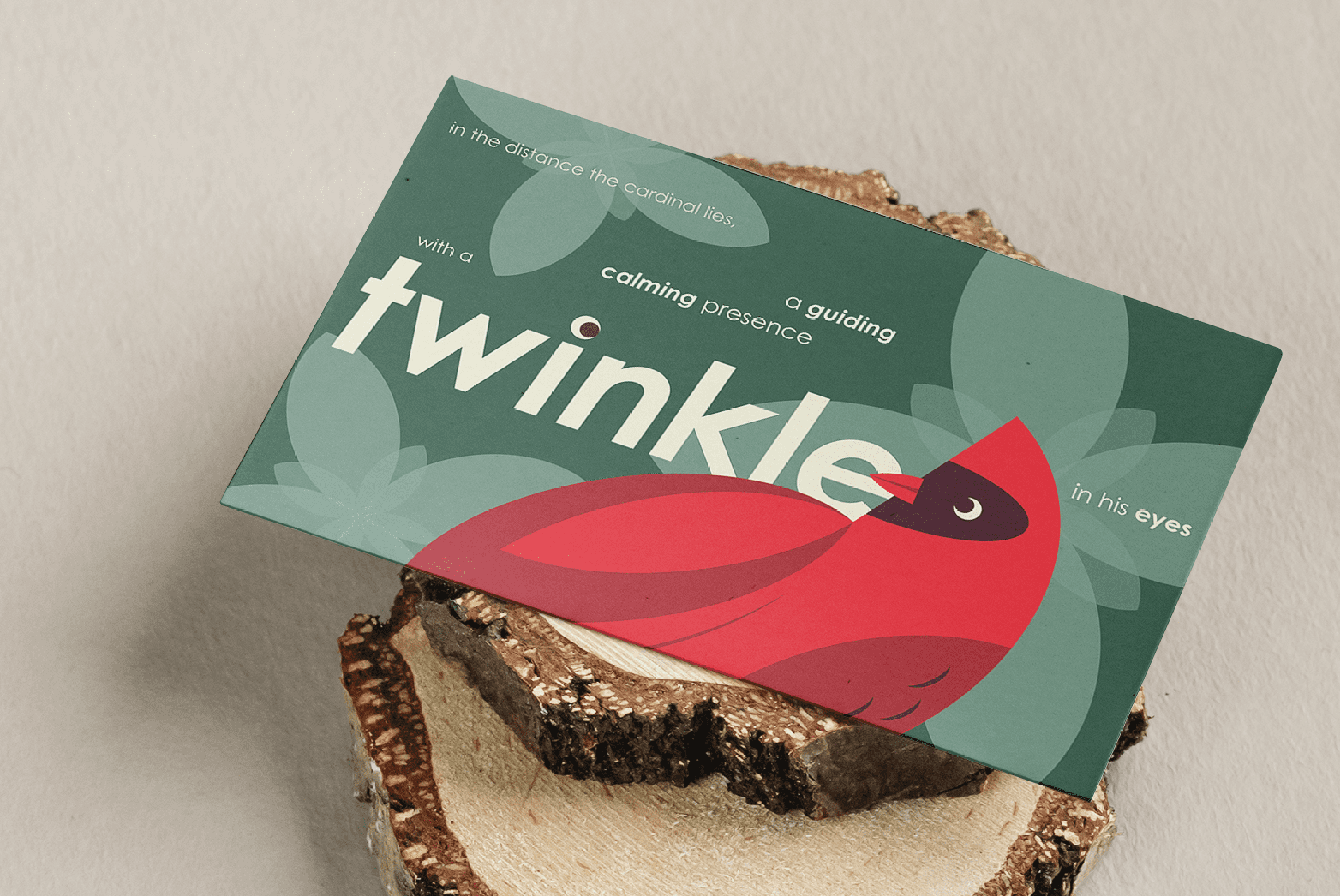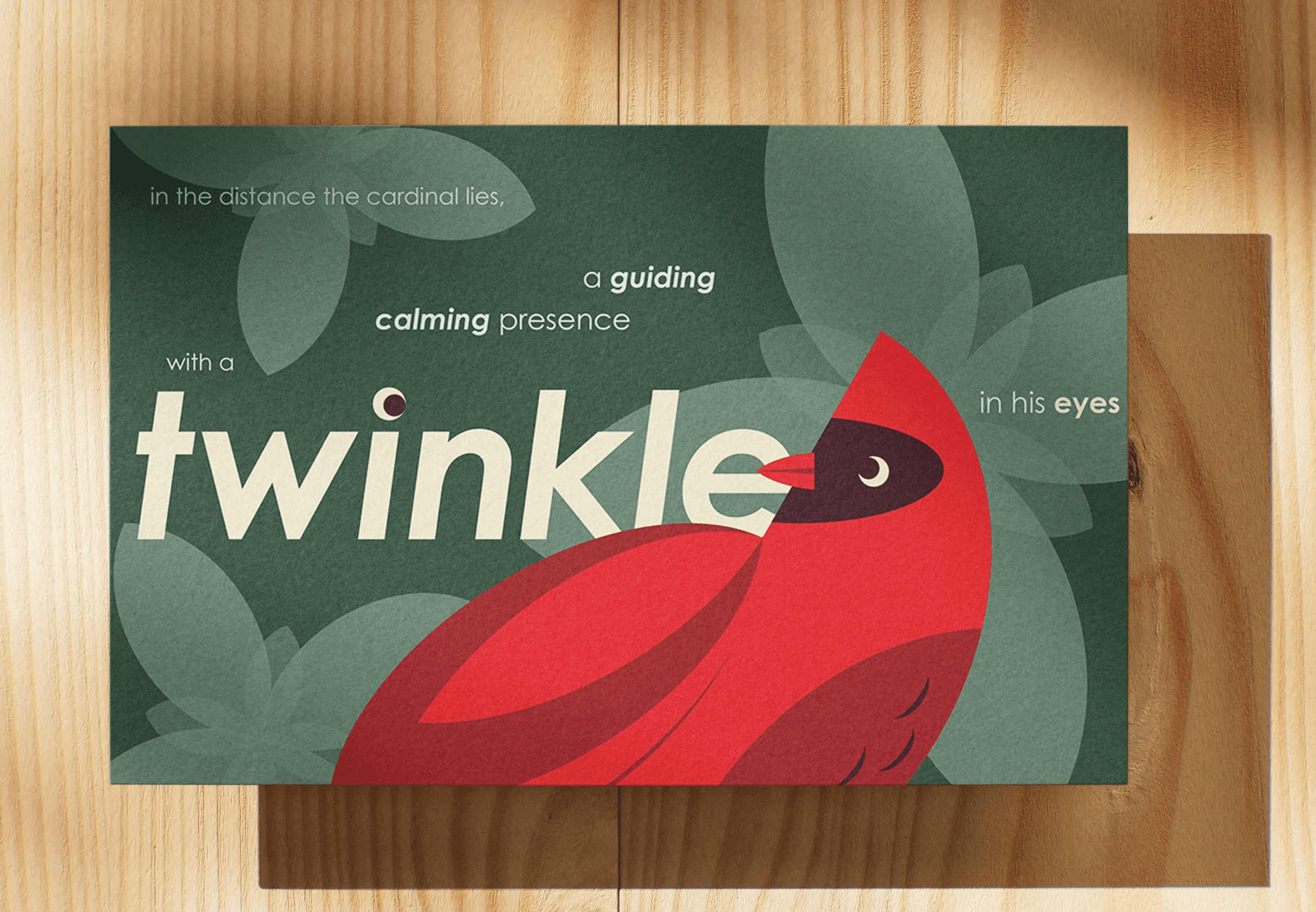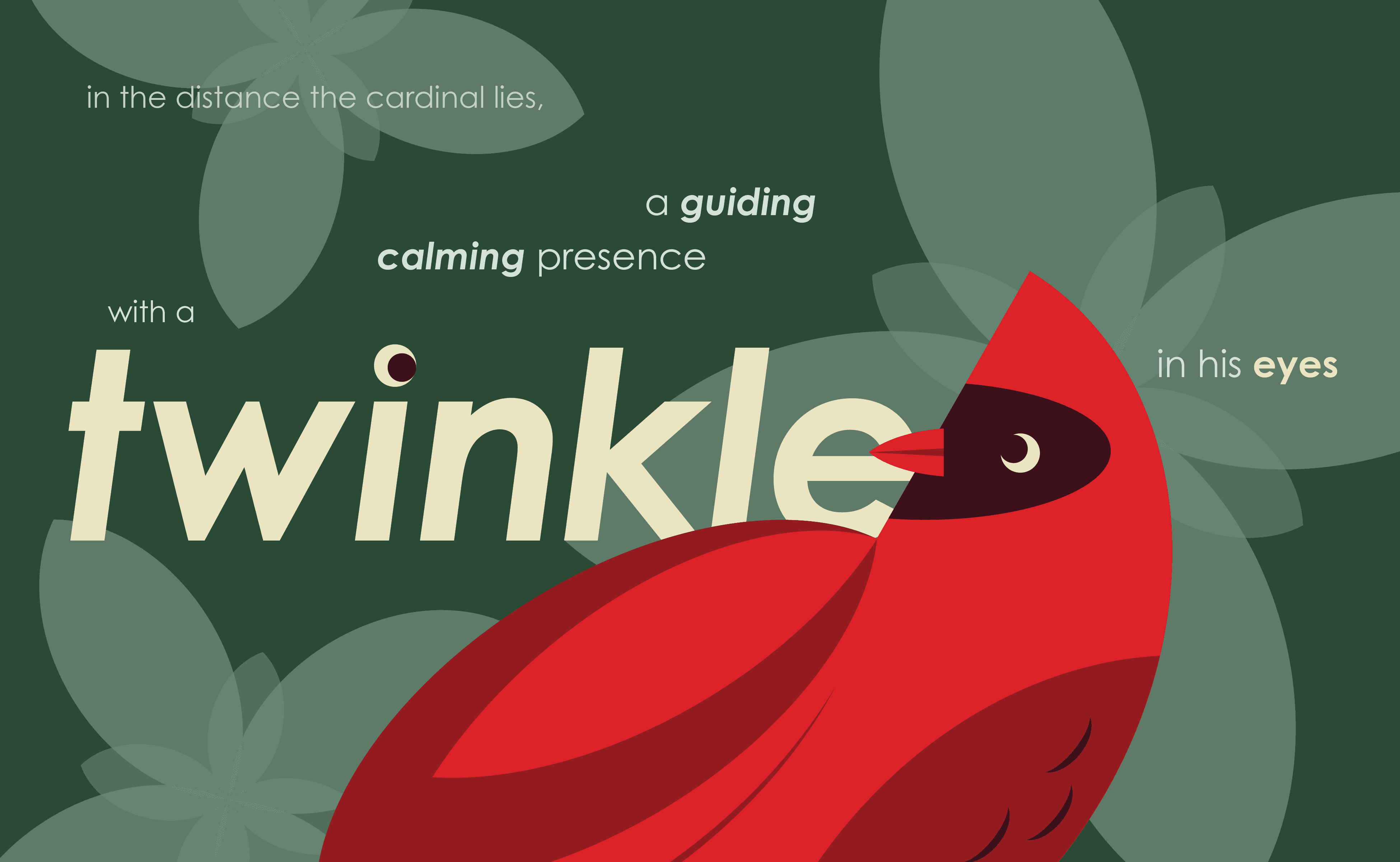 Employing color, size and space, I established a connection between the word “twinkle” and the eye of the cardinal. Additionally, the flower-like shapes in the background not only resemble foliage but also twinkling stars, strengthening the relationship between the visual elements and the cardinal's attributes.
