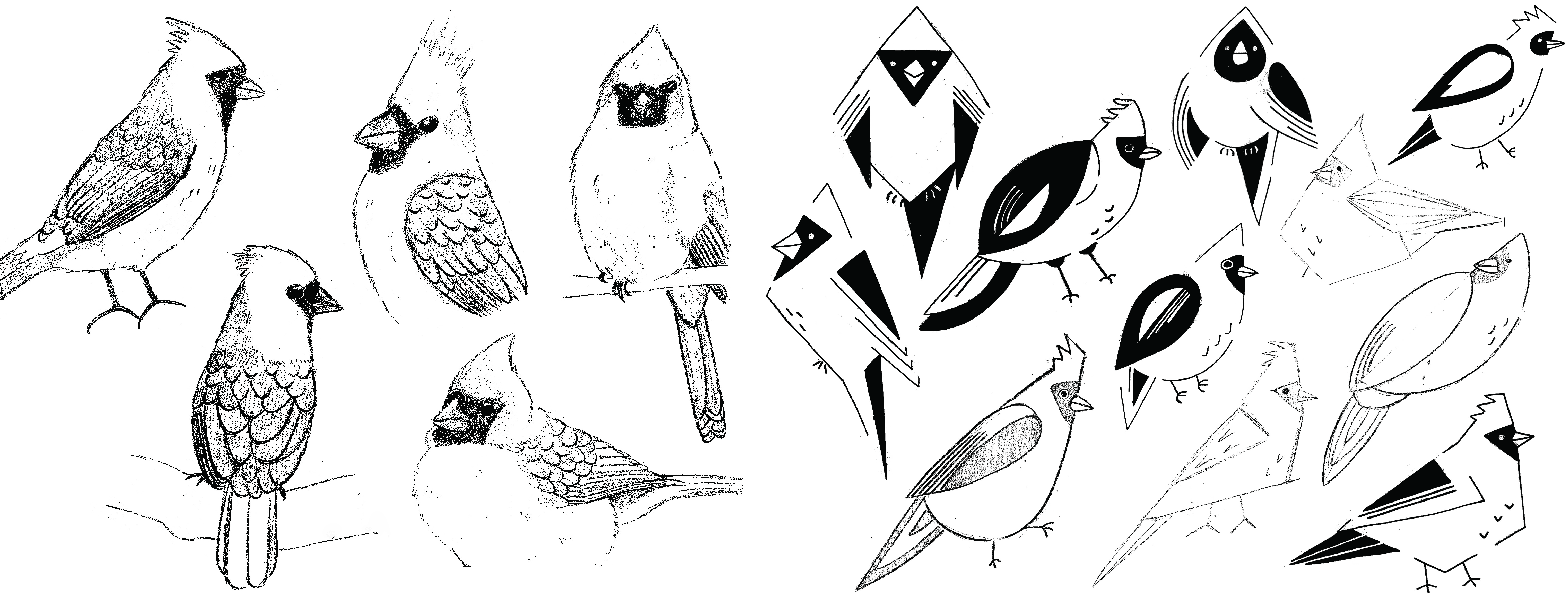 I made my sketches as realistic as possible, exploring how the cardinal appears from different angles and profiles, before simplifying the bird, capturing its essence using only a handful of basic shapes.